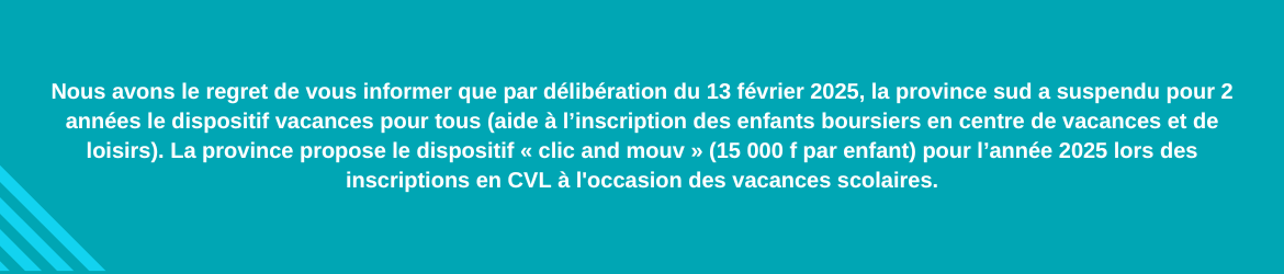 → Opération vacances de la CAFAT – 4000 F /semaine /enfant : 25 58 10 – article sur la page facebook de la CAFAT