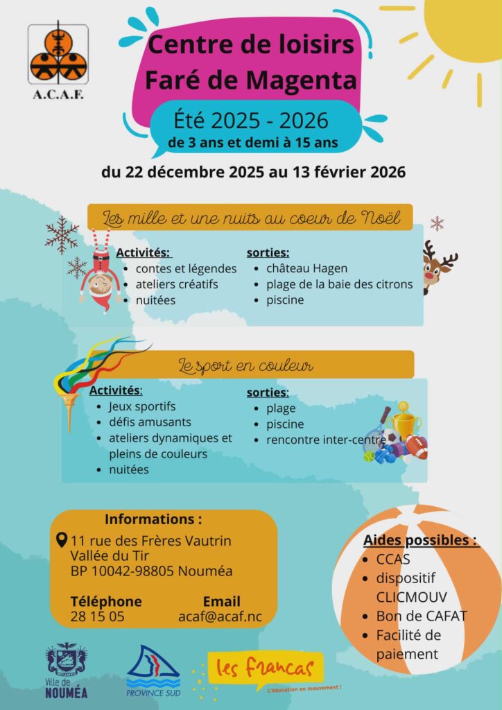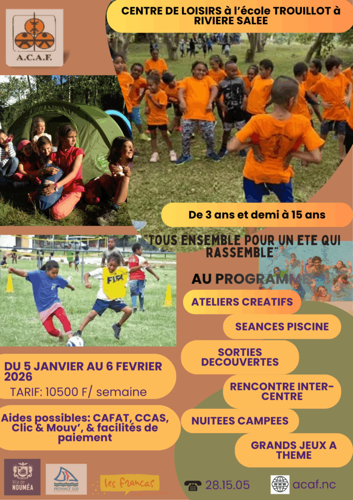 Sachez que des organismes tels que la CAFAT, la Province Sud, le CCAS (de Nouméa notamment) proposent des aides financières aux vacances afin de faciliter l’accès aux loisirs de vos enfants.