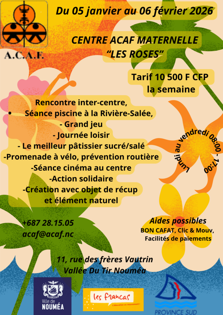 Ces stages durent chacun 14 jours minimum, et doivent se faire dans un Centre de Vacance et de Loisirs (CVL) déclaré auprès de la Direction de la Jeunesse et des Sports de la Nouvelle-Calédonie (DJS NC). Ces deux stages doivent avoir lieu en situation d’encadrement d’une équipe d’au moins deux animateurs. Ces stages sont gratuits, vous pouvez être indemnisés en tant que directeur stagiaire. Au nom de la qualité éducative des loisirs enfance, de l’engagement social et citoyen, l’ACAF encourage les stagiaires à multiplier les expériences pratiques, dans la limite des délais réglementaires, plutôt qu’une course de vitesse pour l’obtention du brevet. C’est la pratique de terrain qui confortera le mieux l’acquisition des compétences. L’ACAF est aussi organisatrice de CVL. Elle organise différents centres de loisirs avec les 4 communes du Grand Nouméa (Nouméa, Dumbéa, Mont-Dore et Païta), et elle peut vous accueillir en stage pratique. Pour vous inscrire en tant que directeur ou directeur adjoint dans l’une de nos actions, vous pouvez nous contacter par mail (acaf@acaf.nc), par téléphone (28 15 05) ou venir nous voir (bureau situé à la 1ère Vallée du Tir, au 11 rue des frères Vautrin).