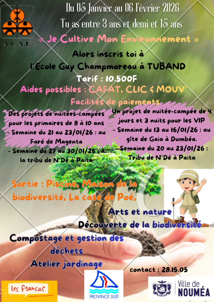 L’ACAF est aussi organisatrice de CVL. Elle organise différents centres de loisirs sur les 4 communes du Grand Nouméa (Nouméa, Dumbéa, Mont-Dore et Païta), et elle peut vous accueillir en stage pratique. Pour vous inscrire en tant qu’animateur dans l’une de nos actions, vous pouvez nous contacter par mail ou venir nous voir (bureau situé à la 1ère Vallée du Tir, au 11 rue des frères Vautrin).